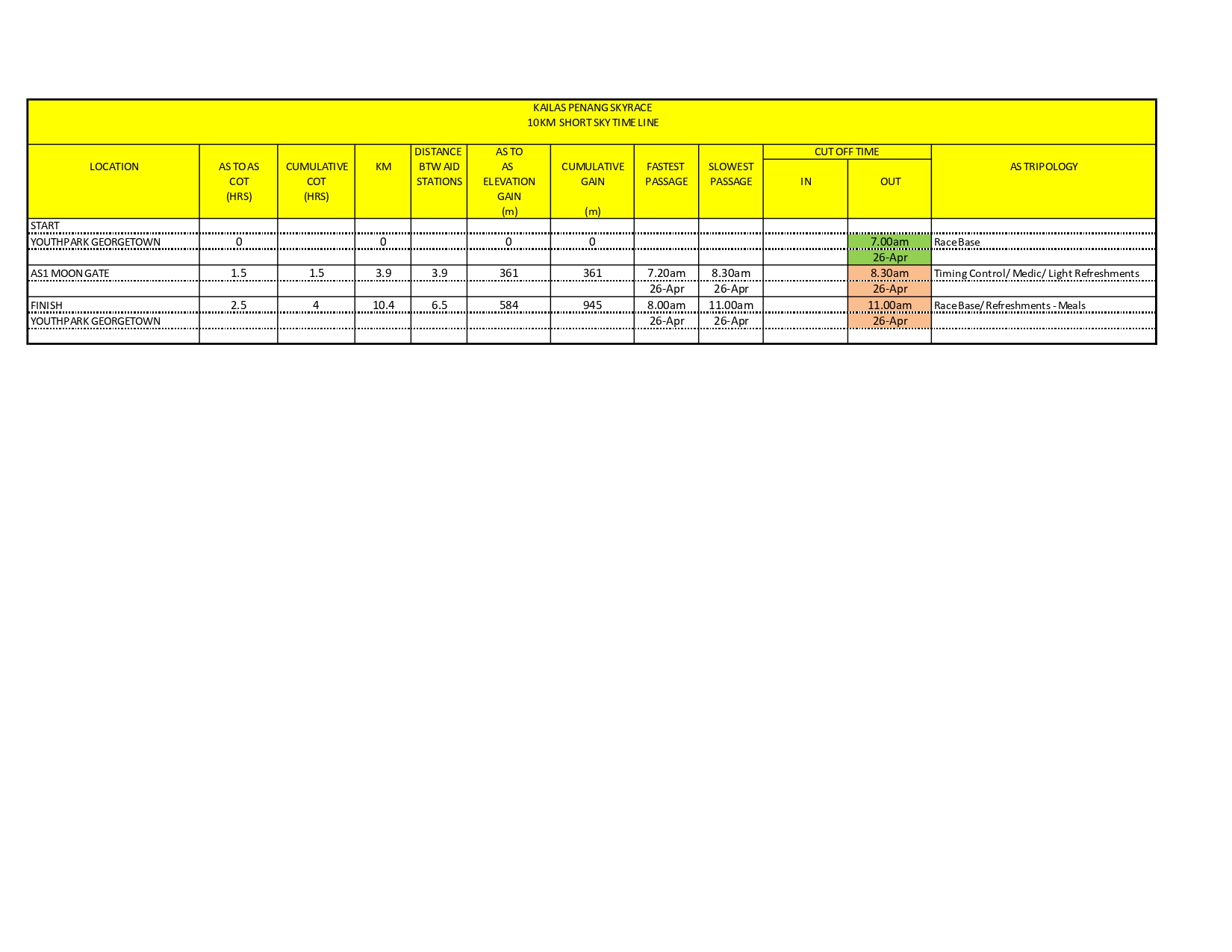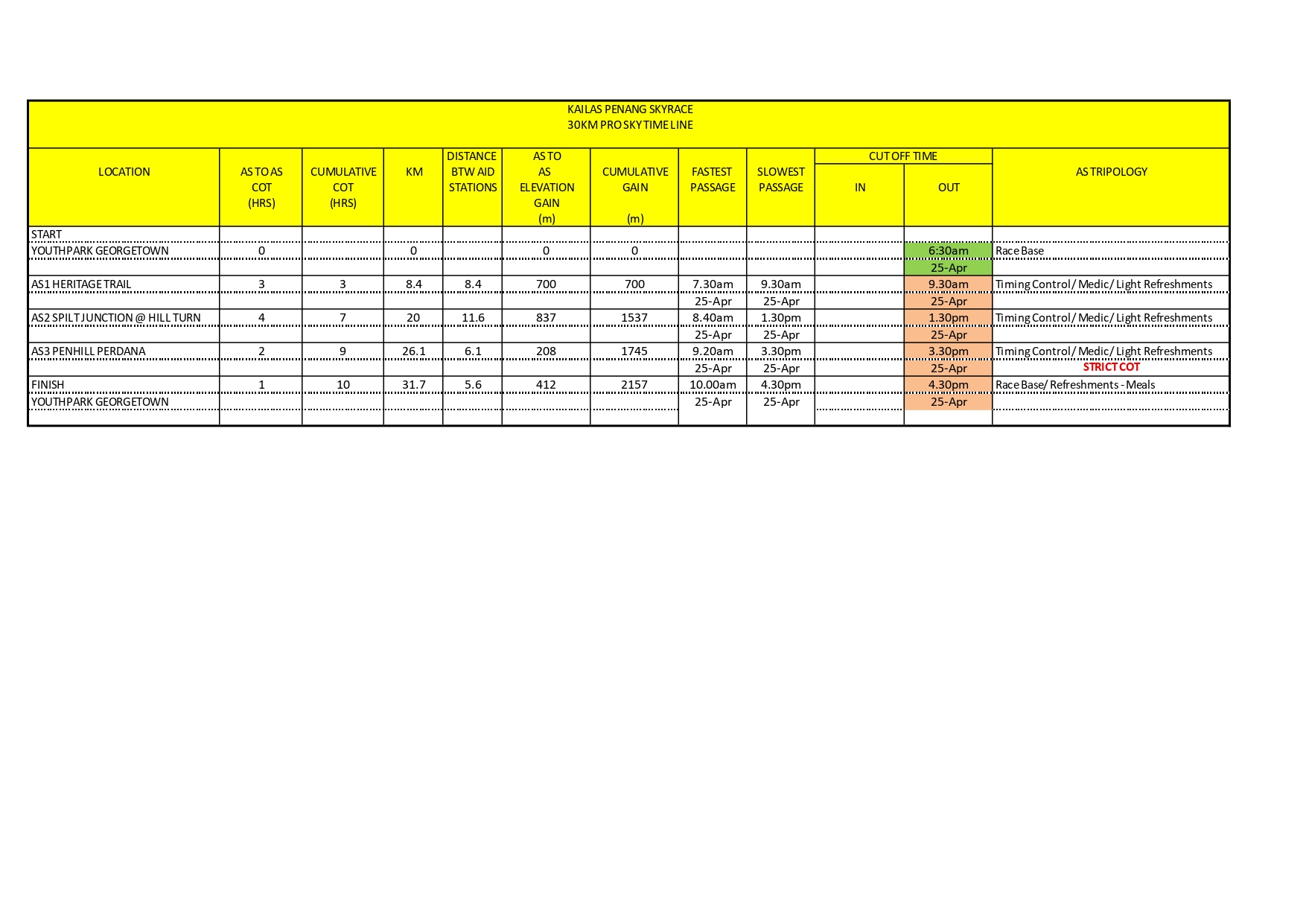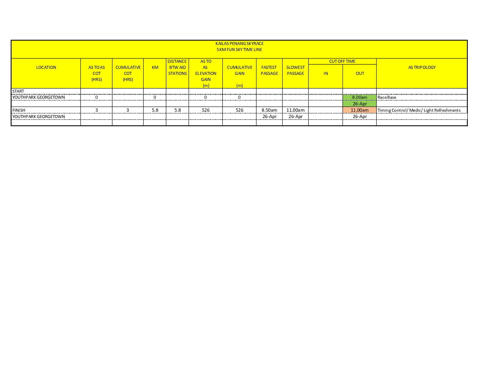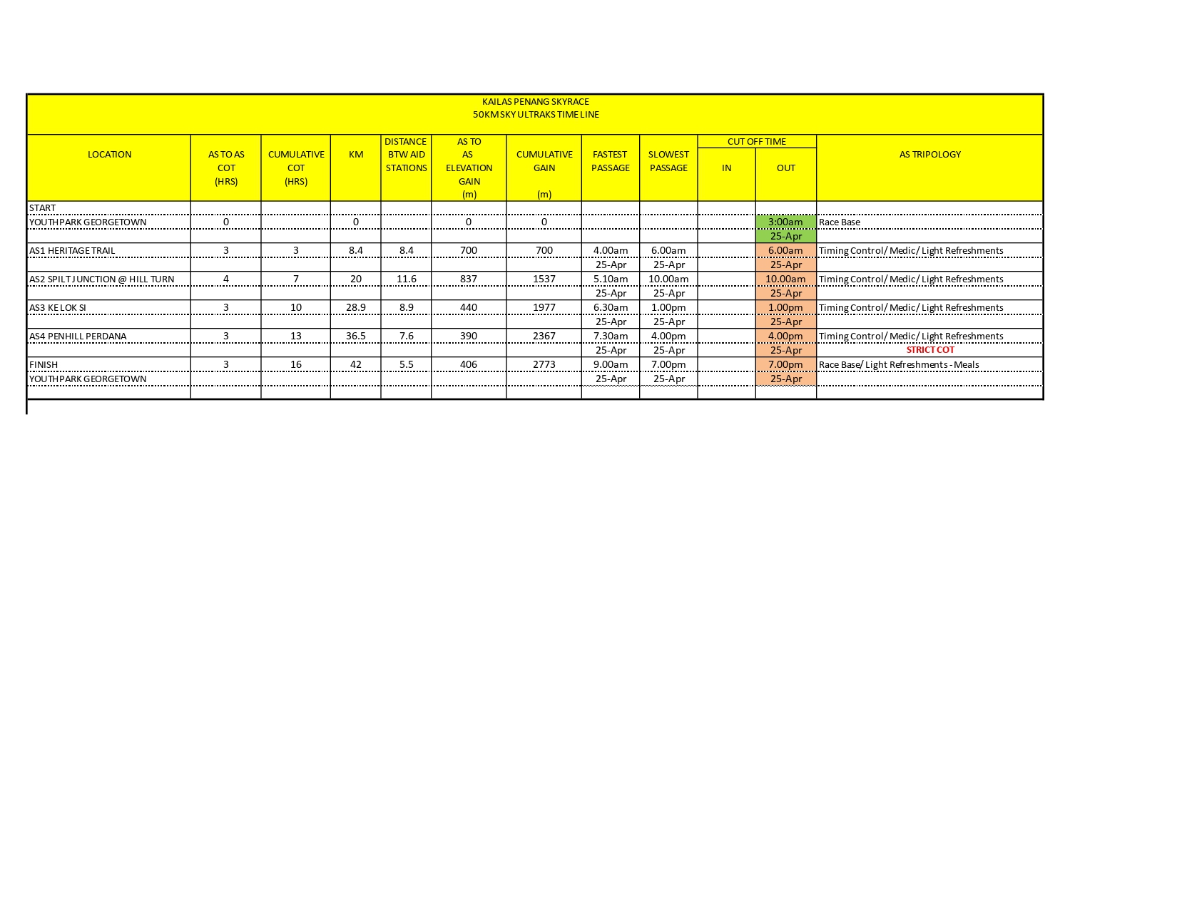 | Cut Off Time (COT) | 07:00PM | Youth Park, Georgetown, Penang (50KM) |